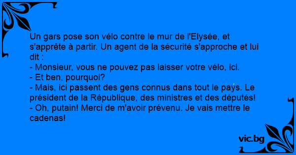 Un gars pose son vélo contre le mur de l'Elysée, et s'apprête à partir. Un agent de la sécurité s'approche et lui dit :