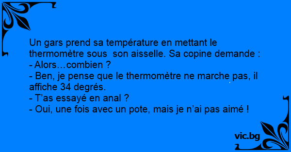 Un gars prend sa température en mettant le thermomètre sous son aisselle. Sa copine demande :
