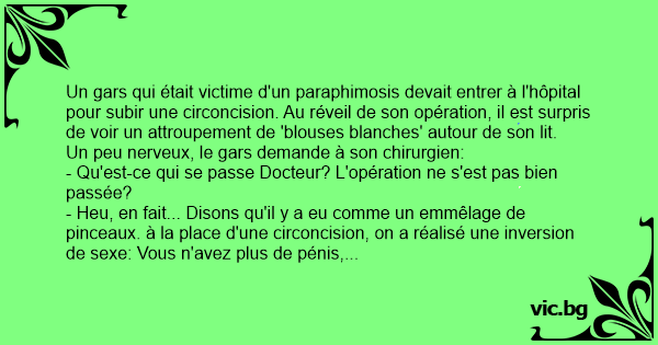 Un gars qui était victime d'un paraphimosis devait entrer à l'hôpital pour subir une circoncision. Au réveil de son opération, il est surpris de voir un attroupement de 'blouses blanches' autour de son lit.