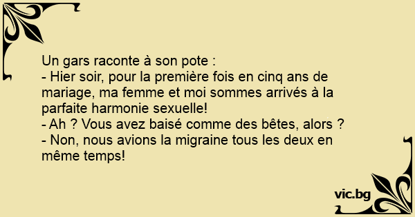 - Hier soir, pour la première fois en cinq ans de mariage, ma femme et moi sommes arrivés à la parfaite harmonie sexuelle!