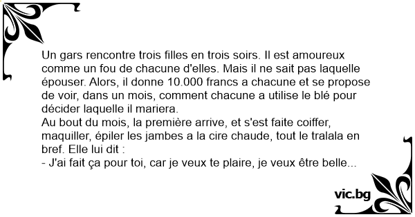 Un gars rencontre trois filles en trois soirs. Il est amoureux comme un fou de chacune d'elles. Mais il ne sait pas laquelle épouser. Alors, il donne 10.000 francs a chacune et se propose de voir, dans un mois, comment chacune a utilise le blé pour décider laquelle il mariera.