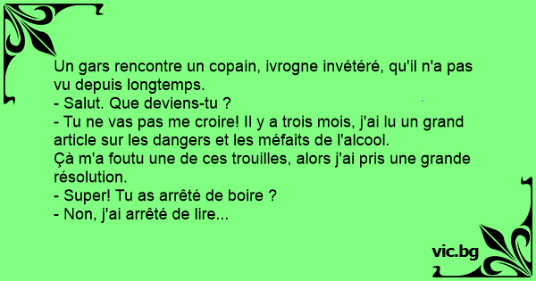 - Tu ne vas pas me croire! Il y a trois mois, j'ai lu un grand article sur les dangers et les méfaits de l'alcool.