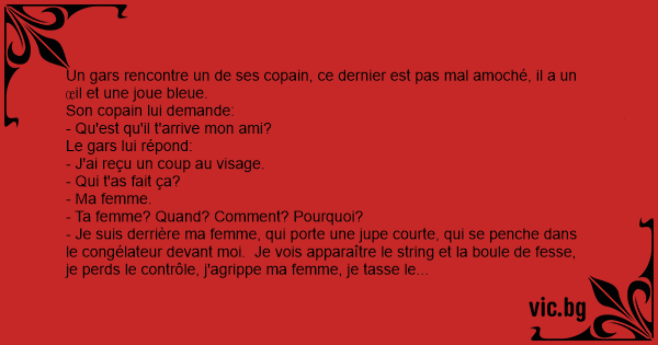 - Je suis derrière ma femme, qui porte une jupe courte, qui se penche dans le congélateur devant moi. Je vois apparaître le string et la boule de fesse, je perds le contrôle, j'agrippe ma femme, je tasse le string et je la prends par derrière. Ce que je me souviens c'est d'avoir reçu un coup de jarret de porc congelé au visage.