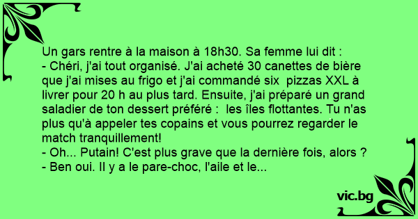 - Chéri, j'ai tout organisé. J'ai acheté 30 canettes de bière que j'ai mises au frigo et j'ai commandé six  pizzas XXL à livrer pour 20 h au plus таrd. Ensuite, j'ai préparé un grand saladier de ton dessert préféré :  les îles flottantes. Tu n'as plus qu'à appeler tes copains et vous pourrez regarder le match tranquillement!