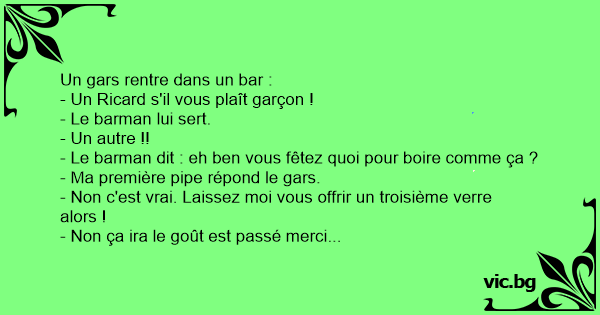 C'est un gars qui va au bistrot : Le gars : Patron, servez moi 7 pastis. Le patron : "-Ok, je vous les sers tous ensemble ?" Le gars : "ouais, vous les alignez là, sur le comptoir ..." Le gars...