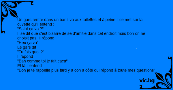 C'est quelqun qui va au toilettes publiques et il entend dans la cabine d'à côté: - Bonjour, comment vas-tu? Il se dit que s'était un drôle d'endroit pour se lier d'amitié avec une personne mais...