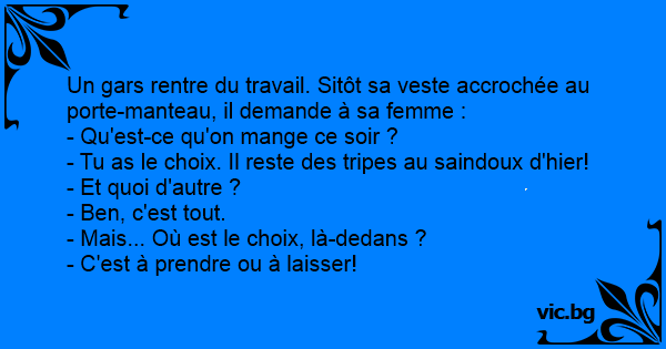 Un gars rentre du travail. Sitôt sa veste accrochée au porte-manteau, il demande à sa femme :