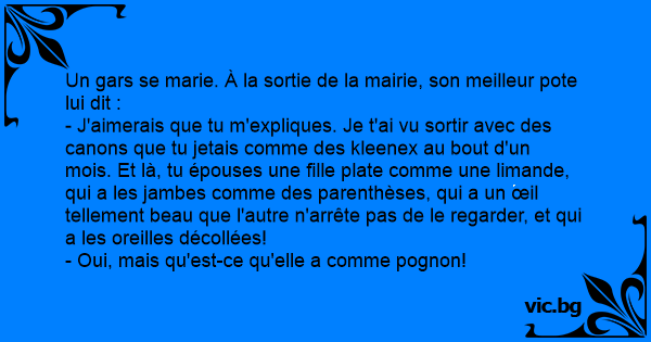Un gars se marie. À la sortie de la mairie, son meilleur pote lui dit :