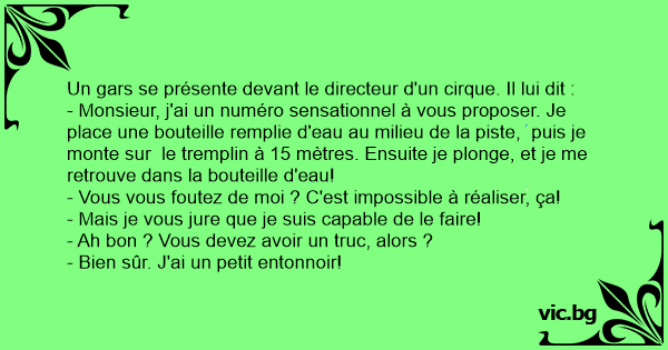 - Monsieur, j'ai un numéro sensationnel à vous proposer. Je place une bouteille remplie d'eau au milieu de la piste, puis je monte sur le tremplin à 15 mètres. Ensuite je plonge, et je me retrouve dans la bouteille d'eau!