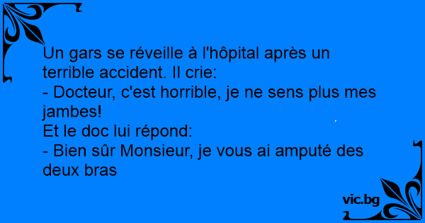 Patienten vaknar upp ur narkosen och ropar förtvivlat: - Doktorn, doktorn, vad har ni gjort???? Jag kan inte känna mina ben... Doktorn: - Det är inte så konstigt, vi har amputerat dina armar...
