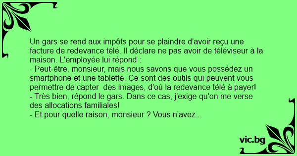 Un gars se rend aux impôts pour se plaindre d'avoir reçu une facture de redevance télé. Il déclare ne pas avoir de téléviseur à la maison. L'employée lui répond :