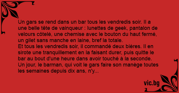Un gars se rend dans un bar tous les vendredis soir. Il a une belle tête de vainqueur : lunettes de geek, pantalon de velours côtelé, une chemise avec le bouton du haut fermé, un gilet sans manche en laine, bref la totale.