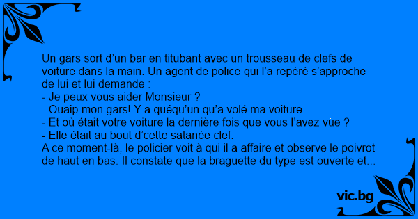 Un gars sort d’un bar en titubant avec un trousseau de clefs de voiture dans la main. Un agent de police qui l’a repéré s’approche de lui et lui demande :