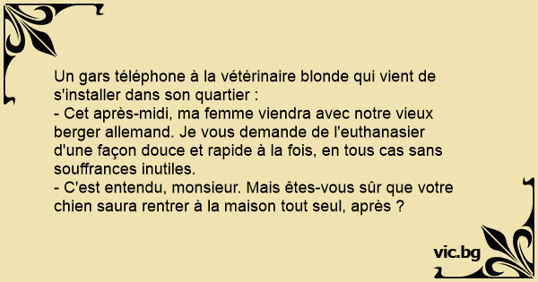 - Cet après-midi, ma femme viendra avec notre vieux berger allemand. Je vous demande de l'euthanasier d'une façon douce et rapide à la fois, en tous cas sans souffrances inutiles.