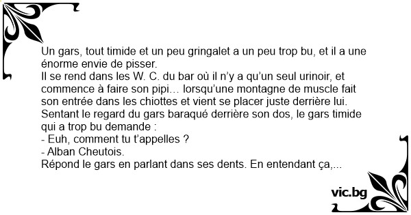 Un gars, tout timide et un peu gringalet a un peu trop bu, et il a une énorme envie de рissеr.