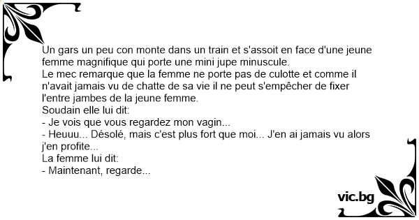In de trein zit een man tegenover een mooie jongedame met een piepklein mini-jurkje aan. Opeens gaat zij verzitten en ziet hij dat ze geen broekje aan heeft. Zij ziet dat en zegt: "Kijk je naar...