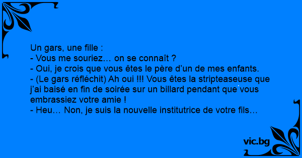 - (Le gars réfléchit) Ah oui !!! Vous êtes la stripteaseuse que j’ai baisé en fin de soirée sur un billard pendant que vous embrassiez votre amie !
