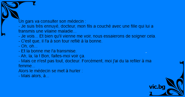 - Mais ce n'est pas tout, docteur. Forcément, moi j'ai du la refiler à ma femme...
