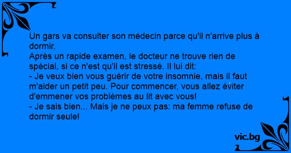 Un gars va consulter son médecin parce qu'il n'arrive plus à dormir.