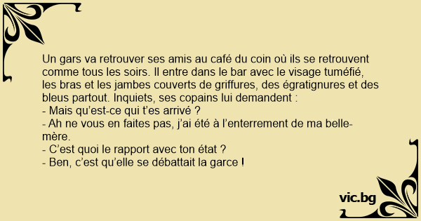 Un gars va retrouver ses amis au café du coin où ils se retrouvent comme tous les soirs. Il entre dans le bar avec le visage tuméfié, les bras et les jambes couverts de griffures, des égratignures et des bleus partout. Inquiets, ses copains lui demandent :