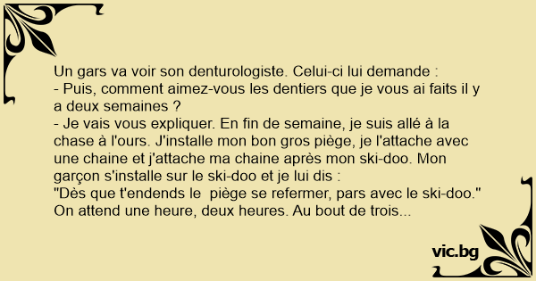 - Je vais vous expliquer. En fin de semaine, je suis allé à la chase à l'ours. J'installe mon bon gros piège, je l'attache avec une chaine et j'attache ma chaine après mon ski-doo. Mon garçon s'installe sur le ski-doo et je lui dis :