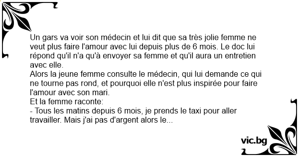 Un gars va voir son médecin et lui dit que sa très jolie femme ne veut plus faire l'amour avec lui depuis plus de 6 mois. Le doc lui répond qu'il n'a qu'à envoyer sa femme et qu'il aura un entretien avec elle.