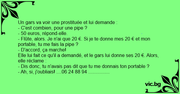 - Flûte, alors. Je n'ai que 20 €. Si je te donne mes 20 € et mon portable, tu me fais la pipe ?