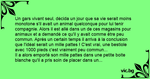 Un gars vivant seul, décida un jour que sa vie serait moins monotone s'il avait un animal quelconque pour lui tenir compagnie. Alors il est allé dans un de ces magasins pour animaux et a demandé ce qu'il y avait comme être peu commun. Après un certain temps il arriva à la conclusion que l'idéal serait un mille pattes ! C'est vrai, une bestiole avec 1000 pieds c'est vraiment peu commun...
