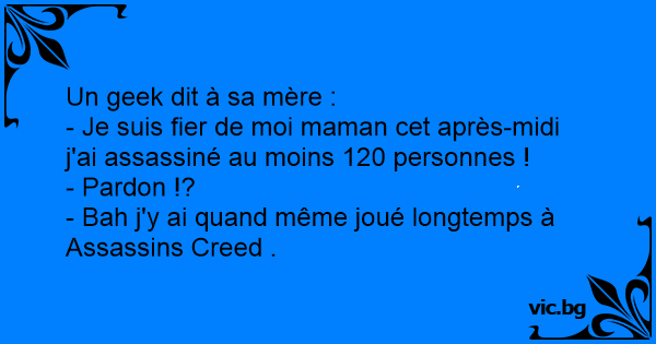 - Je suis fier de moi maman cet après-midi j'ai assassiné au moins 120 personnes !