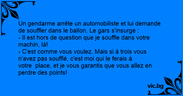 Un gendarme arrête un automobiliste et lui demande de souffler dans le ballon. Le gars s'insurge :