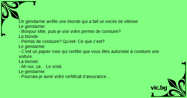 Алкотест Wheelchair Driving H Ξανθιά με το κάμπριο... Αλκοτέστ Полицай получава обаждане по радиостанцията от свой колега: Полицай спира огромен Мерцедес, вътре красива блондинка: Ein Polizist stoppt eine blonde Frau, die einfach etwas zu schnell gefahren ist. Polizist: Un gendarme arrête une blonde pour excès de vitesse. - Permis SVP ! - C'est quoi le permis ? - Papier rose ! - Ah ! Oui ! Tenez. - Assurance ! - C'est quoi l'assurance ? - Papier vert ! Le gendarme se gratte l'entre-jambe par hasard, après des heures de poste et la blonde s'écrit : - Ah ! Non... Polismannen stoppade en röd sportbil och gick fram till den för att be föraren om körkort och registreringsbevis. - Wow det var en riktigt läcker liten blondin det där, tänkte han. - Har du... One day while on patrol, a police officer pulled over a car for speeding. He went up to the car and asked the driver to roll down her window. The first thing he noticed, besides the nice red sports... Een dom blondje rijd op de weg. Er komt een politie auto langs haar rijden en zet haar aan de kant van de weg. “Wat is er aan de hand agent?” vraagt het domme blondje. Ondertussen haalt de agent... Una loca jugaba corriendo en su silla de ruedas a lo largo del pasillo del manicomio imitando el ruido de un automóvil. De repente sale un loco de una habitación, la detiene y le dice: - Disculpe... Polisen stoppar en blondin i en röd sportbil, går fram till henne, då hon vevar ner rutan. - Körkort? säger polisen. - Vad är det? undrar blondinen. - Ja, ditt bevis på att du har tillgång till att... Numa blitz o guarda para a bela loira e pede os documentos. — Que documentos? — pergunta ela, com ar inocente. — A sua Carteira de Habilitação! — Carteira de Habilitação? O que é isso? O guarda já... A policeman pulls a blonde in a sports car over for speeding and is trying to explain to her what and where her driver’s license might be. After she eventually gives him her driver’s license, he... Un poliziotto ferma un’auto per eccesso di velocita’. Fa segno di abbassare il finestrino e vede una fantastica bionda: “Patente, prego!”. Lei: “Patente? Cos’e’?”. Il poliziotto: “E’ quel documento... Sarışın yıldız adayı, üstü açık kırmızı arabasını gecenin bir vakti iyice tenhalaşmış ve loşlaşmış Hollywood Bulvarı'nda hızla sürerken trafik polisi çevirdi.. - "Hanımefendi, ehliyetiniz lütfen.."... Poliisi pysäyttää blondin moottoritiellä - Saisinko nähdä ajokorttinne? - Mikä se on? - Se on kortti, jossa on kuvanne. - Tässä. - Ja sitten rekisteriote. - Mikä se on? - Se on se paperi, jossa on... Poliisi pysäyttää blondin moottoritiellä Poliisi: Saisinko nähdä ajokortinne? Blondi: Mikä se on? Poliisi: Se on kortti, jossa on kuvanne. Blondi: Tässä. Poliisi: Ja sitten rekisteriote. Blondi:... Un poliziotto ferma una bionda che si sta’ facendo una strada a senso unico nel verso sbagliato. Poliziotto: “Ma si rende conto dove sta andando ?” Bionda: “no, ma dovunque sia, deve essere un... Uma loira com seu Porche passa por um radar a uma velocidade de 200 K/h e é parada por um guarda de trânsito. O policial gentilmente pede o documento do veículo e a loira responde: — O que é isso?!... Miami ‘de üstü açık spor arabasıyla gezen sarışın afet’i trafik polisi durdurur. - Hanımefendi ehliyetinizi görebilirmiyim ? - Nedir o? - Hani araç kullanırken yanınızda taşımanız gereken... Numa avenida movimentada na cidade de São João Nepomuceno interior de Minas, um guarda de trânsito (um negão de uns dois metros),pára uma loira que avançou o sinal; — Minha senhora, a carteira de... Um dia a loira estava dirigindo em alta velocidade e o guarda parou ele _Deixa eu ver sua carteira de motorista! — E eu sei la o que e isso seu guarda. — O IPVA do carro esta pago? — Eu tambem nao... Policjant zatrzymuje blondynkę: - "Poproszę prawo jazdy!" - "A co to jest" - "To taki kartonik ze zdjęciem uprawniający do prowadzenia pojazdu" - "Aha, proszę bardzo" - "Poproszę jeszcze dowód...