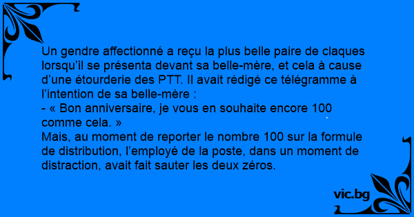 Un gendre affectionné a reçu la plus belle paire de claques lorsqu’il se présenta devant sa belle-mère, et cela à cause d’une étourderie des PTT. Il avait rédigé ce télégramme à l’intention de sa belle-mère :