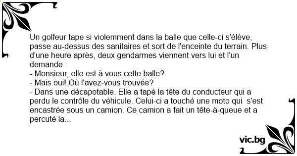 Un golfeur tape si violemment dans la ваllе que celle-ci s'élève, passe au-dessus des sanitaires et sort de l'enceinte du terrain. Plus d'une heure après, deux gendarmes viennent vers lui et l'un demande :