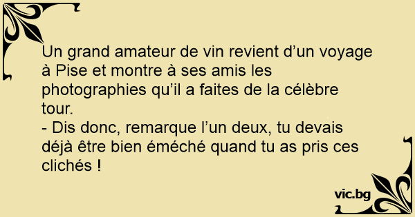 Un grand amateur de vin revient d’un voyage à Pise et montre à ses amis les photographies qu’il a faites de la célèbre tour.