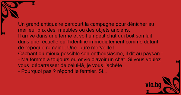 - Ah non ! fait le fermier, le bol vous le laissez ici ! Depuis le début de l'année, il m'a déjà fait vendre quinze chats...