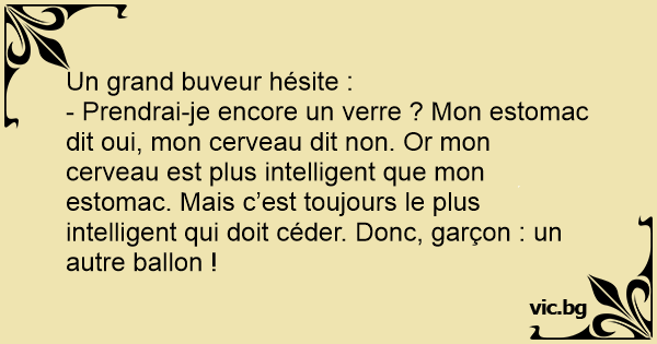 - Prendrai-je encore un verre ? Mon estomac dit oui, mon cerveau dit non. Or mon cerveau est plus intelligent que mon estomac. Mais c’est toujours le plus intelligent qui doit céder. Donc, garçon : un autre ballon !