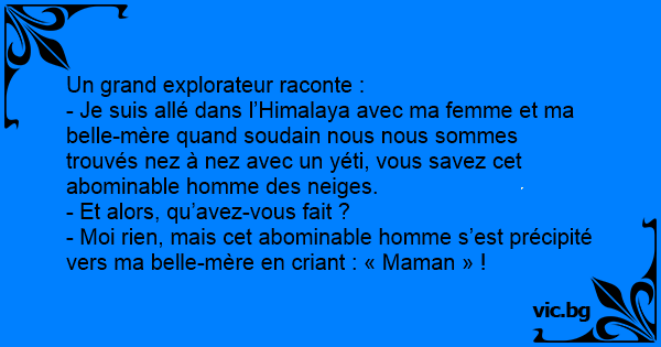 - Je suis allé dans l’Himalaya avec ma femme et ma belle-mère quand soudain nous nous sommes trouvés nez à nez avec un yéti, vous savez cet abominable homme des neiges.