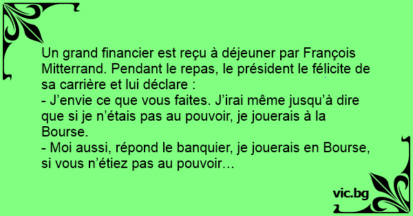 Un grand financier est reçu à déjeuner par François Mitterrand. Pendant le repas, le président le félicite de sa carrière et lui déclare :