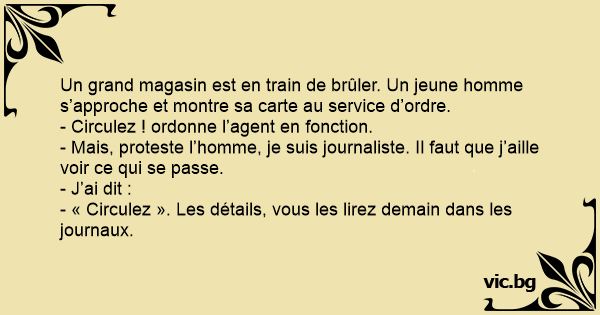- Mais, proteste l’homme, je suis journaliste. Il faut que j’aille voir ce qui se passe.