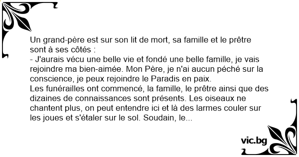 - J'aurais vécu une belle vie et fondé une belle famille, je vais rejoindre ma bien-aimée. Mon Père, je n'ai aucun péché sur la conscience, je peux rejoindre le Paradis en paix.