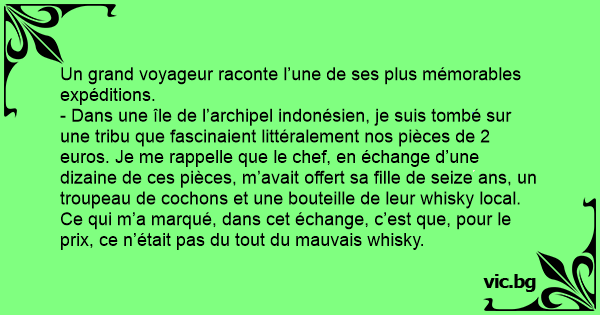 - Dans une île de l’archipel indonésien, je suis tombé sur une tribu que fascinaient littéralement nos pièces de 2 euros. Je me rappelle que le chef, en échange d’une dizaine de ces pièces, m’avait offert sa fille de seize ans, un troupeau de cochons et une bouteille de leur whisky local. Ce qui m’a marqué, dans cet échange, c’est que, pour le prix, ce n’était pas du tout du mauvais whisky.