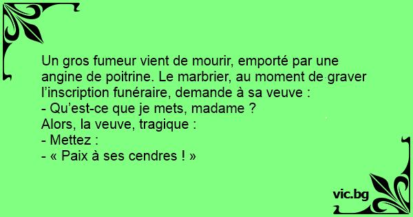 Un gros fumeur vient de mourir, emporté par une angine de poitrine. Le marbrier, au moment de graver l’inscription funéraire, demande à sa veuve :