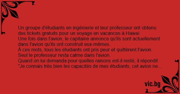 À ces mots, tous les étudiants ont pris peur et quittèrent l'avion. Seul le professeur resta calme dans l'avion.