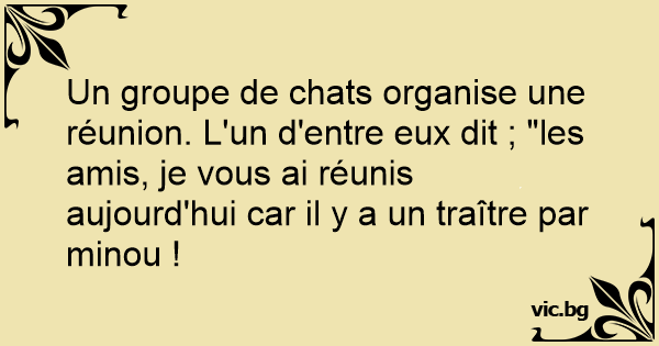 Un groupe de chats organise une réunion. L'un d'entre eux dit ; "les amis, je vous ai réunis aujourd'hui car il y a un traître par minou !