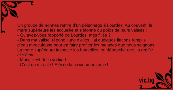 Un groupe de nonnes rentre d’un pèlerinage à Lourdes. Au couvent, la mère supérieure les accueille et s’étonne du poids de leurs valises :