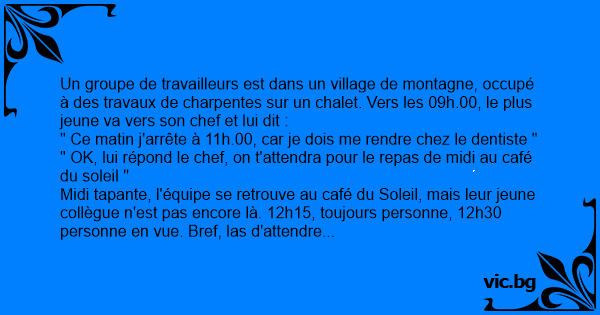 Un groupe de travailleurs est dans un village de montagne, occupé à des travaux de charpentes sur un chalet. Vers les 09h.00, le plus jeune va vers son chef et lui dit :