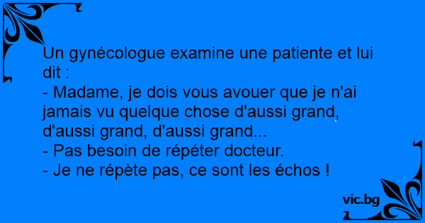 C'est une femme qui consulte son gynéco: - Docteur, mon mari me dit que mon sexe est trop grand, enfin trop large quoi... - Déshabillez-vous, je vais vous donner mon avis. La femme se déshabille et se met sur la table d'auscultation. Et là le docteur crie: - Quelle chatte immense!! Quelle chatte...
