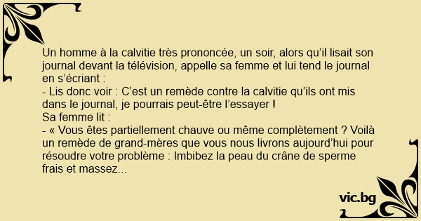 Un homme à la calvitie très prononcée, un soir, alors qu’il lisait son journal devant la télévision, appelle sa femme et lui tend le journal en s’écriant :
