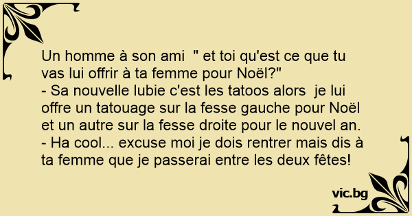 - Sa nouvelle lubie c'est les tatoos alors je lui offre un tatouage sur la fesse gauche pour Noël et un autre sur la fesse droite pour le nouvel an.