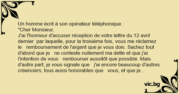 J'ai l'honneur d'accuser réception de votre lettre du 12 avril dernier par laquelle, pour la troisième fois, vous me réclamez le remboursement de l'argent que je vous dois. Sachez tout d'abord que je ne conteste nullement ma dette et que j'ai l'intention de vous rembourser aussitôt que possible. Mais d'autre part, je vous signale que j'ai encore beaucoup d'autres créanciers, tous aussi honorables que vous, et que je souhaite rembourser aussi. C'est pourquoi, chaque mois, je mets tous les noms de mes créanciers dans un chapeau et en tire un au hasard que je m'empresse de rembourser immédiatement. J'ose espérer que votre nom sortira bientôt. Entre-temps, je vous prie d'agréer, Monsieur, l'assurance de mes sentiments distingues.
